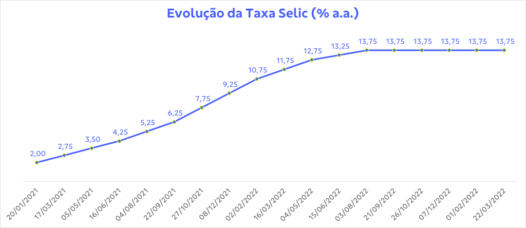 Entre março de 2021 e agosto de 2022 a Selic acumulou uma série de 12 altas consecutivas, saindo de 2% para 13,75%, um total de 11,75 pontos percentuais. Este foi o maior ciclo de alta para a taxa em 13 anos, refletindo os impactos da inflação após a pandemia de Covid-19. O valor atual é o mais elevado para Selic desde novembro de 2016, quando a taxa chegou a 14%.