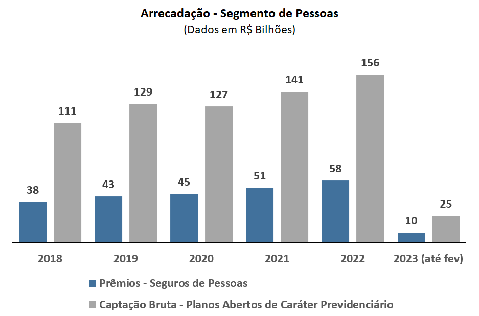 Com o resultado, o mercado totalizou R$ 25,2 bilhões de arrecadação no primeiro bimestre, somando prêmios e contribuições, alta de 6% em relação ao mesmo período de 2022. Considerando apenas fevereiro, o valor foi de R$ 11,3 bilhões.