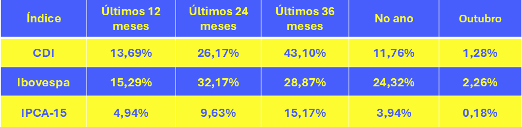 Os fundos têm como estratégia majoritária a alocação em ativos indexados à inflação de curto prazo. Em outubro, o IPCA-15 registrou variação de 0,18%, abaixo da mediana das projeções do mercado. Para os próximos meses, esperamos novas surpresas baixistas, puxadas por energia elétrica e reajustes nos preços da gasolina.